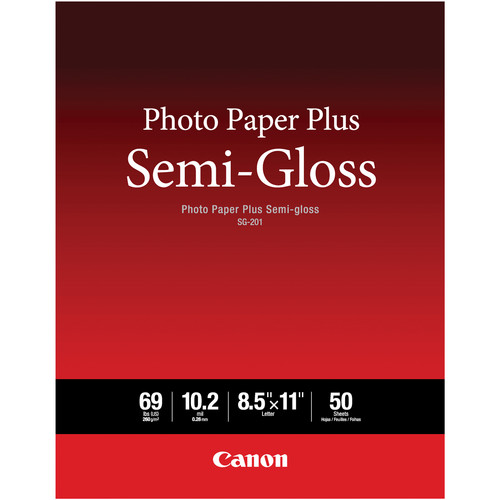 Click images to enlarge: List Price $ 34.99Manufacturers Item number: 1686B063PAPER,SG-201,8.5X11,50,WHPhoto lab quality prints right at home. High-quality inkjet paper produces vibrant images with low glare and a soft glossy finish. Size: 8 1/2 x 11; Paper Color(s): White; Paper Weight: 69 lb; Sheets Per Unit: 50.Package Includes Includes 50 sheetsManufactured by Canon Product SpecificsSold as Pack with 50 SheetsTo order a carton, order 10 PackItem may be returned for 30 days from date of purchaseUPS ShippableAssembly Required: NoMade from Recycled Material: NoItem Weight: 1.95 lbs.Carton Weight: 21 lbs.No Material Safety Data Sheet 8-1/2 x 11; CANON; Inkjet; Photo Paper Plus; Pixma; Semi-Gloss; Consumables; Snapshots; Pictures; Photography; Arts; Sheets