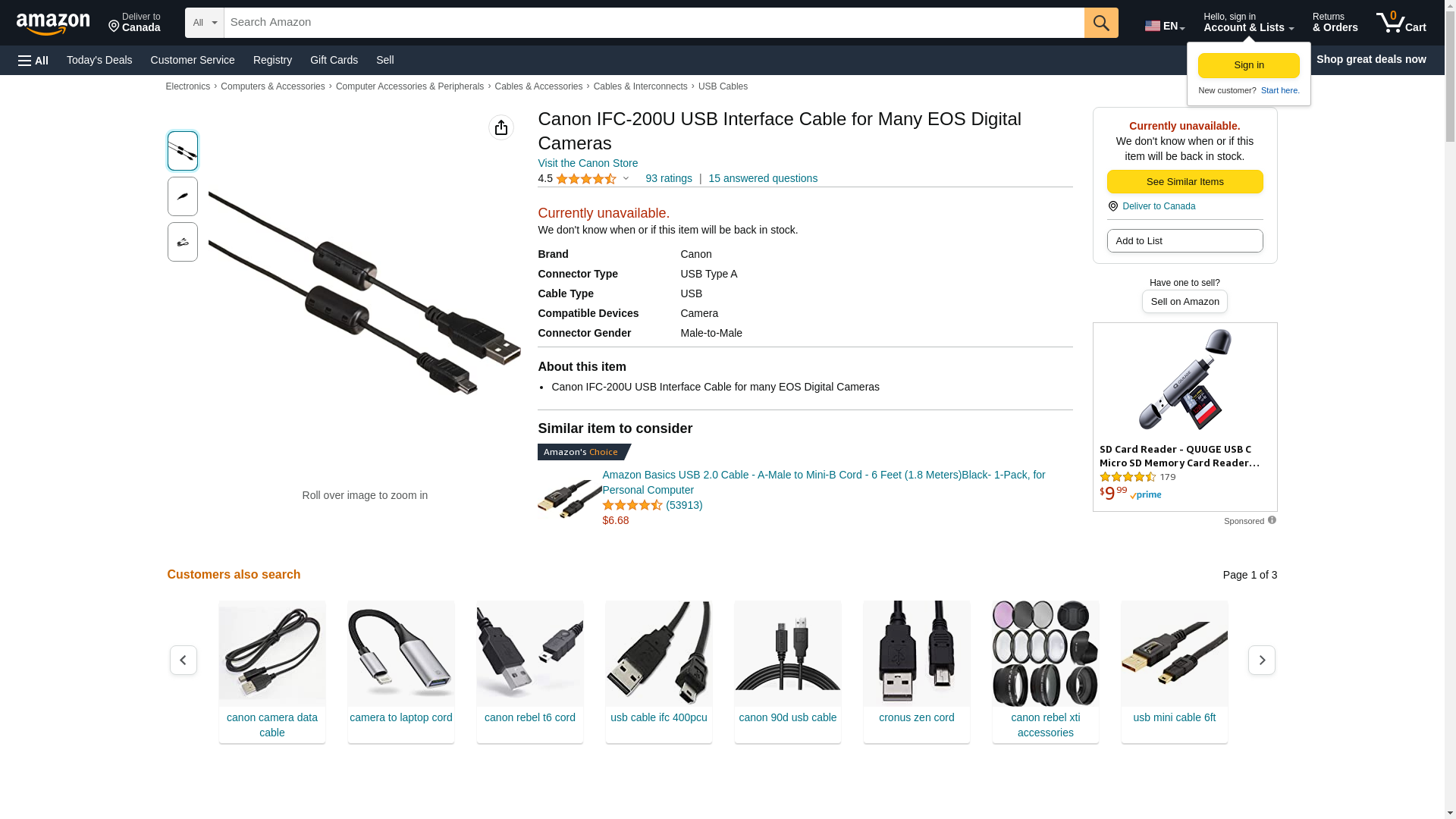 | Feature | Canon IFC-200U USB Interface Cable for many EOS Digital Cameras |