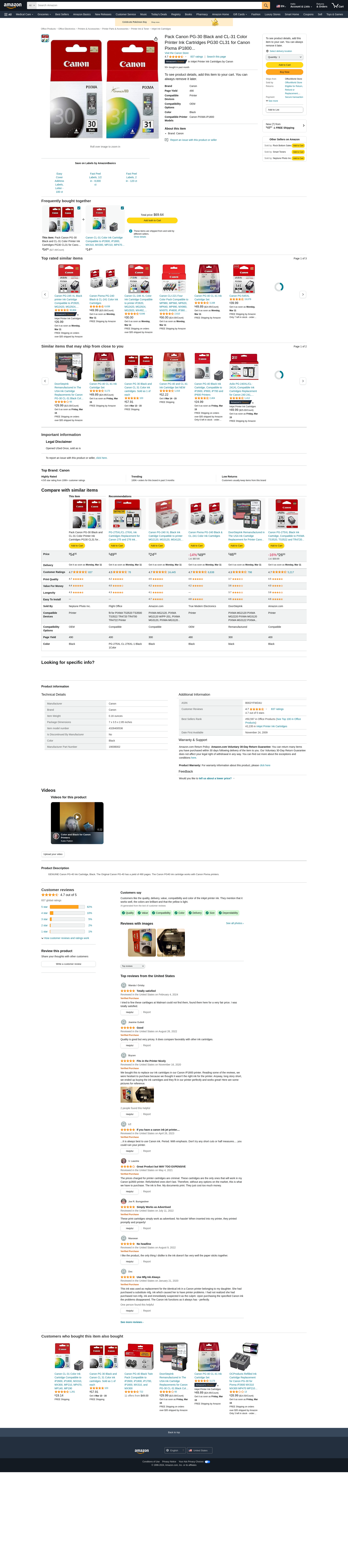 Pack Canon PG-30 Black and CL-31 Color Printer Ink Cartridges PG30 CL31 for Canon Pixma iP1800...