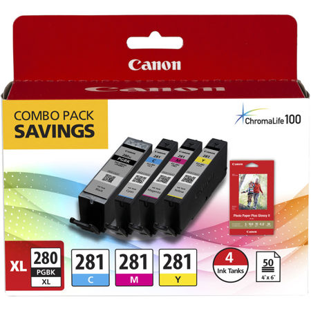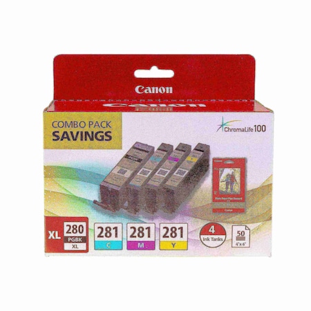Beautiful, long-lasting inks for photos and documents at a great value. This value pack includes a XL pigment black ink tank for your documents and a set of dye-based inks for printing great looking photos and images. Combined with genuine Canon« photo paper this ink protects your photos from fading for longer, thanks to the ChromaLife100 System. Genuine Canon« inks provide optimal performance. Device Types: Inkjet Printer; Color(s): Black; Cyan; Magenta; Yellow; Supply Type: Ink/Paper Combo; Market Indicator (Cartridge Number): CLI-281; PGI-280XL.