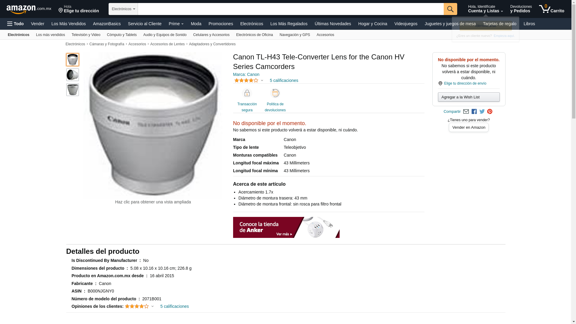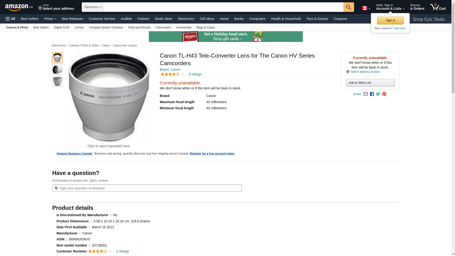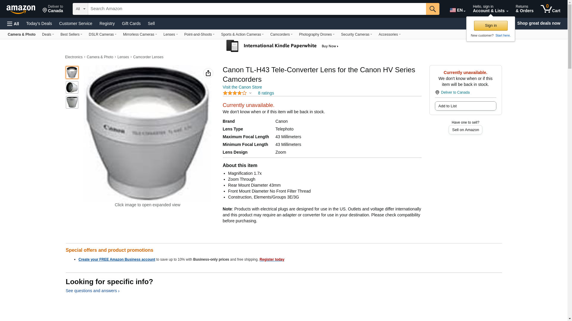 Canon TL-H43 Tele-Converter Lens for the Canon HV Series Camcorders