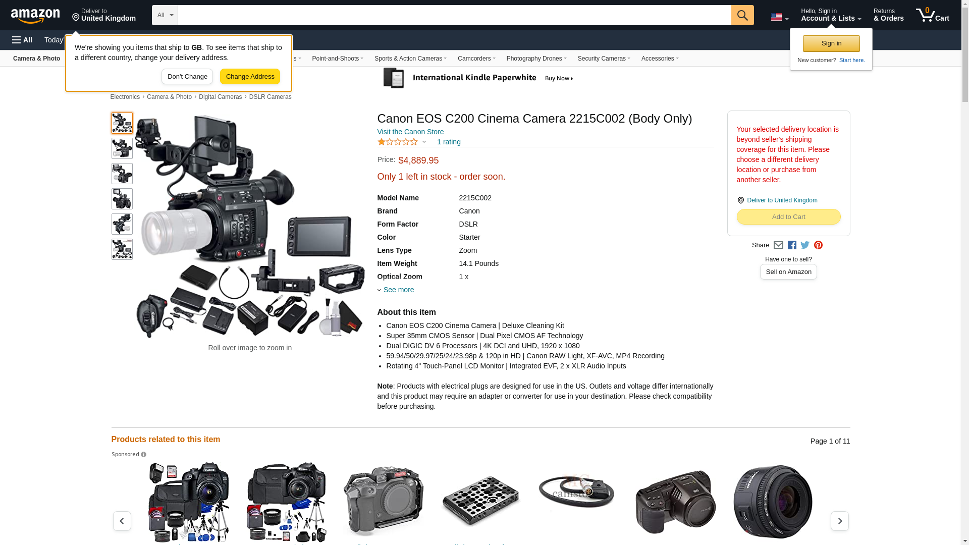 Canon's EOS C200 EF Cinema Camera features a built-in EVF, 4" LCD screen, top handle, Super 35mm CMOS sensor, and Dual Pixel Autofocus. The EF lens mount on the EOS C200 offers compatibility not only with Canon's existing broad range of DSLR lenses but also with their line of EF-mount CN-E cinema prime and zoom lenses. The Super 35mm sensor is paired with Canon's Dual DIGIC DV 6 image processor, allowing it to capture and record up to DCI 4K resolution.<br><br><br><br>Manufacturer Included Items:<br> Canon EOS C200 Cinema Camera (EF-Mount)<br> LM-V1 4" LCD Monitor for Canon C200 & C300 Mk II<br> LA-V1 LCD Attachment Unit for EOS C200<br> HDU-2 Handle Unit for EOS C200/C200B<br> GR-V1 Camera Grip for EOS C200<br> Shoulder Strap<br> CA-A10 Compact Power Adapter for EOS C300 Mark II, C200, and C200B Camcorders<br> Single Battery Charger for EOS C300 Mark II, C200, and C200B Batteries<br> Compact Power Adapter<br> UN-5 Unit Cable for Canon EOS C200, C300 Mark II, C700, and XC15 (20"')<br> Eyecup <br> BP-A30 Battery Pack For EOS C300 Mark II, C200, and C200B<br> Shoulder Strap<br> Tape Measure Hook<br> Thumb Rest<br> Body Cap<br> Limited 1-Year Warranty<br><br>Items Included in Bundle: <br> Canon EF-S 17-55mm f/2.8 IS USM Lens<br> LCD Screen Protectors<br> Deluxe 5 Piece Lens Cleaning Kit;<br> Microfiber Cloth<br> Lens Cleaning Fluid<br> 5pc Cotton Swabs<br> Blower Brush<br> Lens Tissue Paper<br><br>