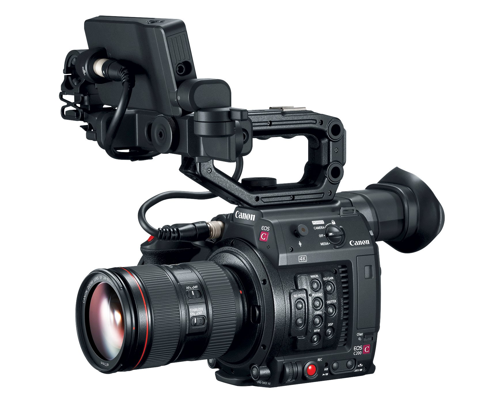 - Canon's EOS C200 EF Cinema Camera features a built-in EVF, 4" LCD screen, top handle, Super 35mm CMOS sensor, and Dual Pixel Autofocus