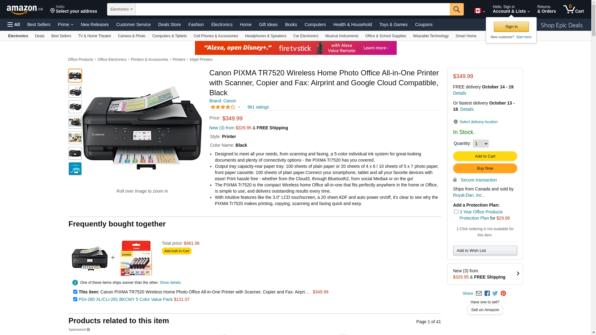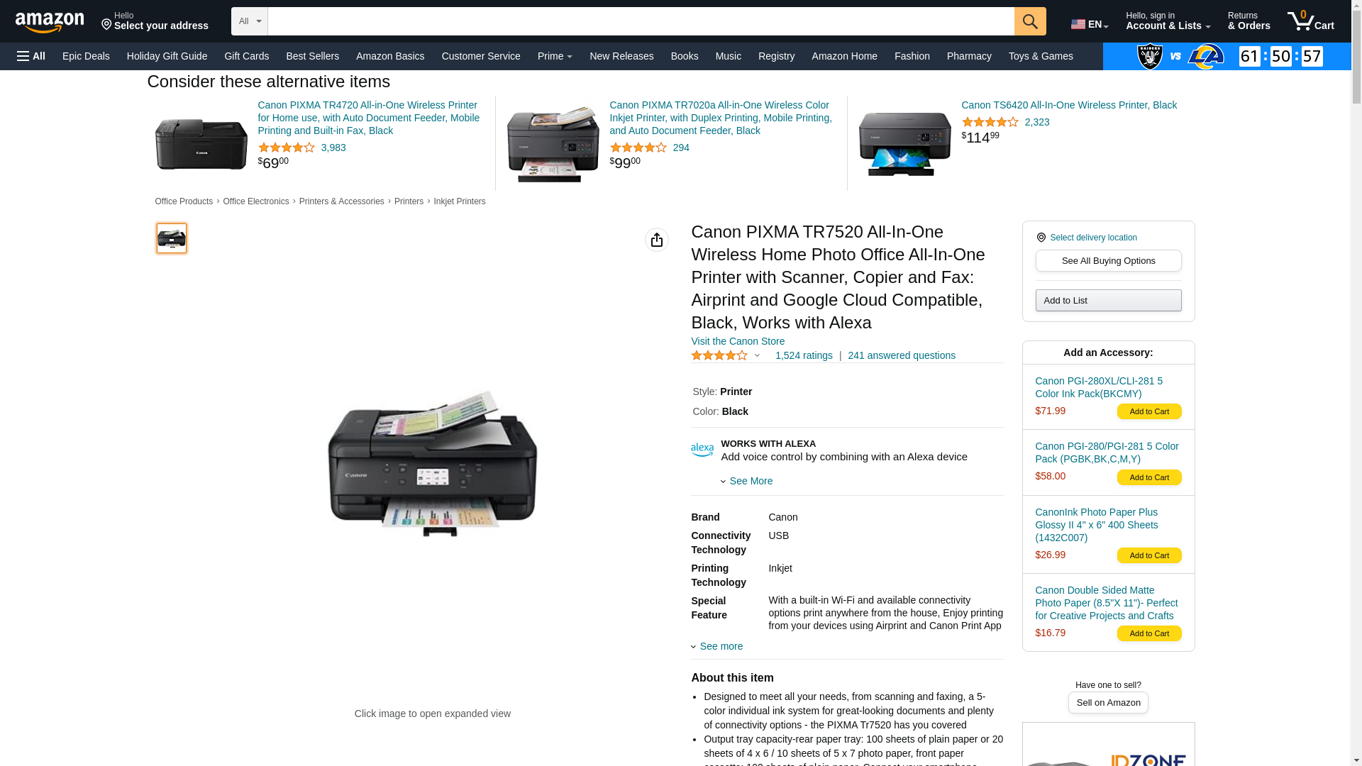 Canon PIXMA TR7520 All-In-One Wireless Home Photo Office All-In-One Printer with Scanner, Copier and Fax: Airprint and Google Cloud Compatible, Black, Works with Alexa
