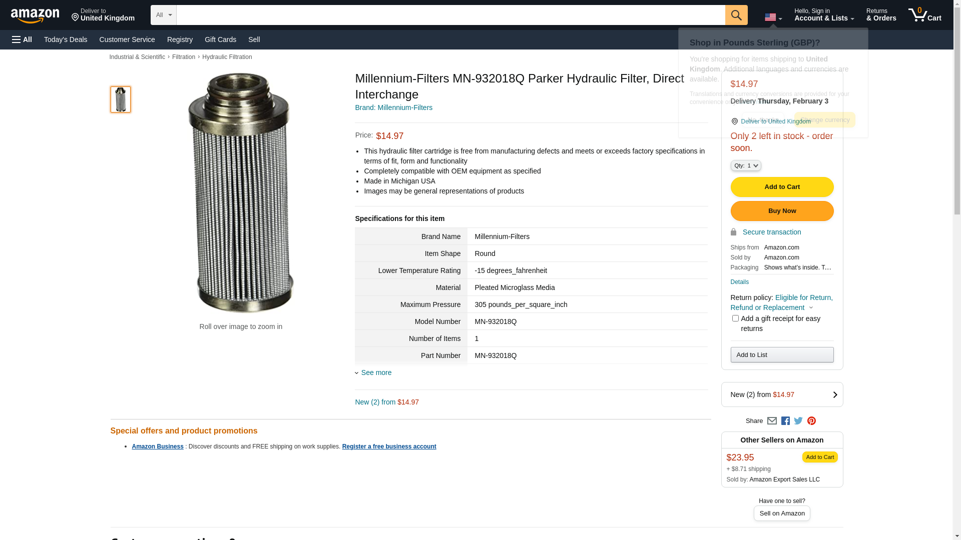 Millennium-Filters MN-932018Q PARKER Hydraulic Filter, Direct Interchange. This hydraulic filter cartridge is free fr...