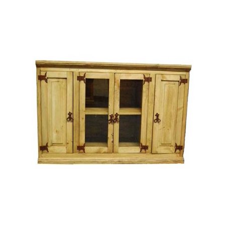 Two shelves. Glass door storage at the center. Wood door storage at the sides. Warranty: One year. Made from white pine. Shelves: 20 in. W x 12 in. H. Side storage: 10 in. W x 12 in. H. Overall: 45 in. W x 19.5 in. D x 31 in. H (45 lbs.). Makes a great stand alone piece.