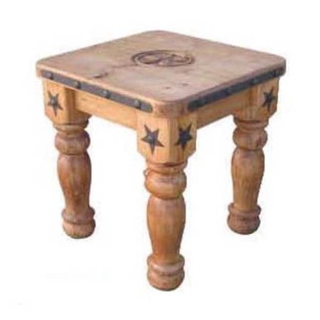 Solid 5 in. square legs. Hand carved star. Iron accents. Warranty: One year. Made from white pine. 24 in. W x 23 in. D x 23 in. H (25 lbs.).