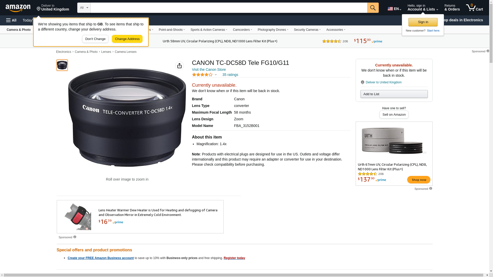 Canon TC-DC58D Tele Converter Lens for Canon G10 and G11 Digital Camera-requires LA-DC58K Lens Adapter