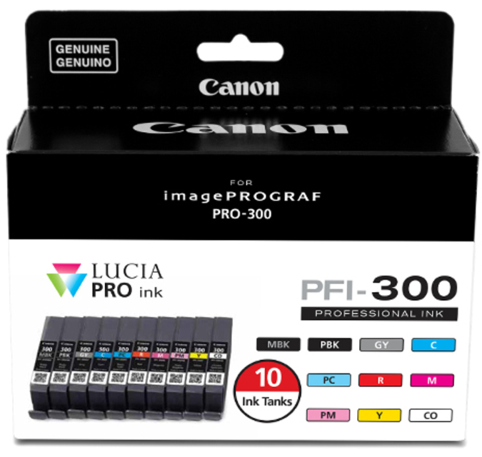 - This PFI-300 10 Color Pack contains a full set of inks (MBK, PBK, C, M, Y, PM, PC, R, GY, CO) for the PRO-300 Professional Photographic Inkjet Printer.