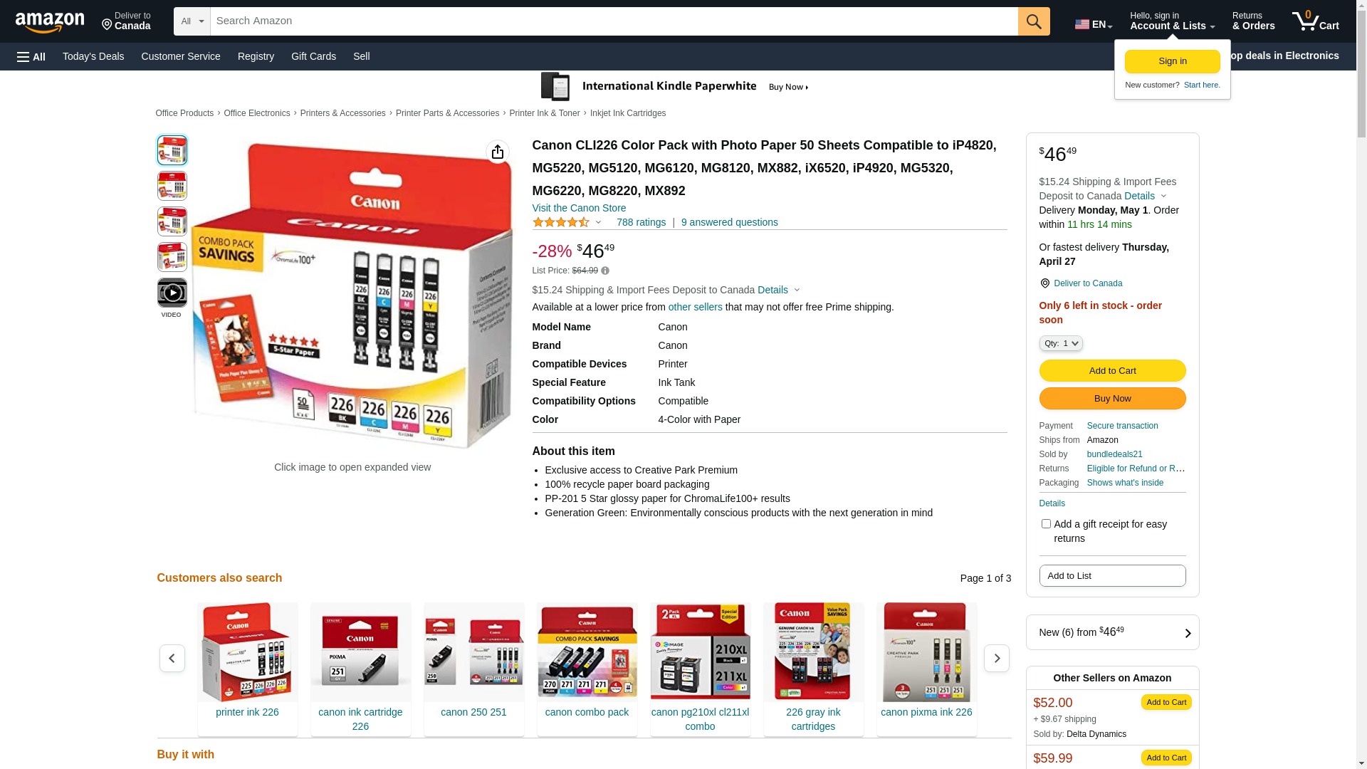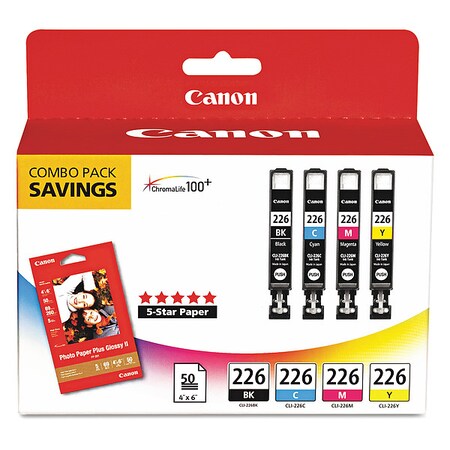 | Feature | CLI-226BK/CLI-226C,M,Y Combo pack has the 3 colored inks and 1 black ink plus a pack of PP-201 (50sheet) glossy paperall in one value pack |