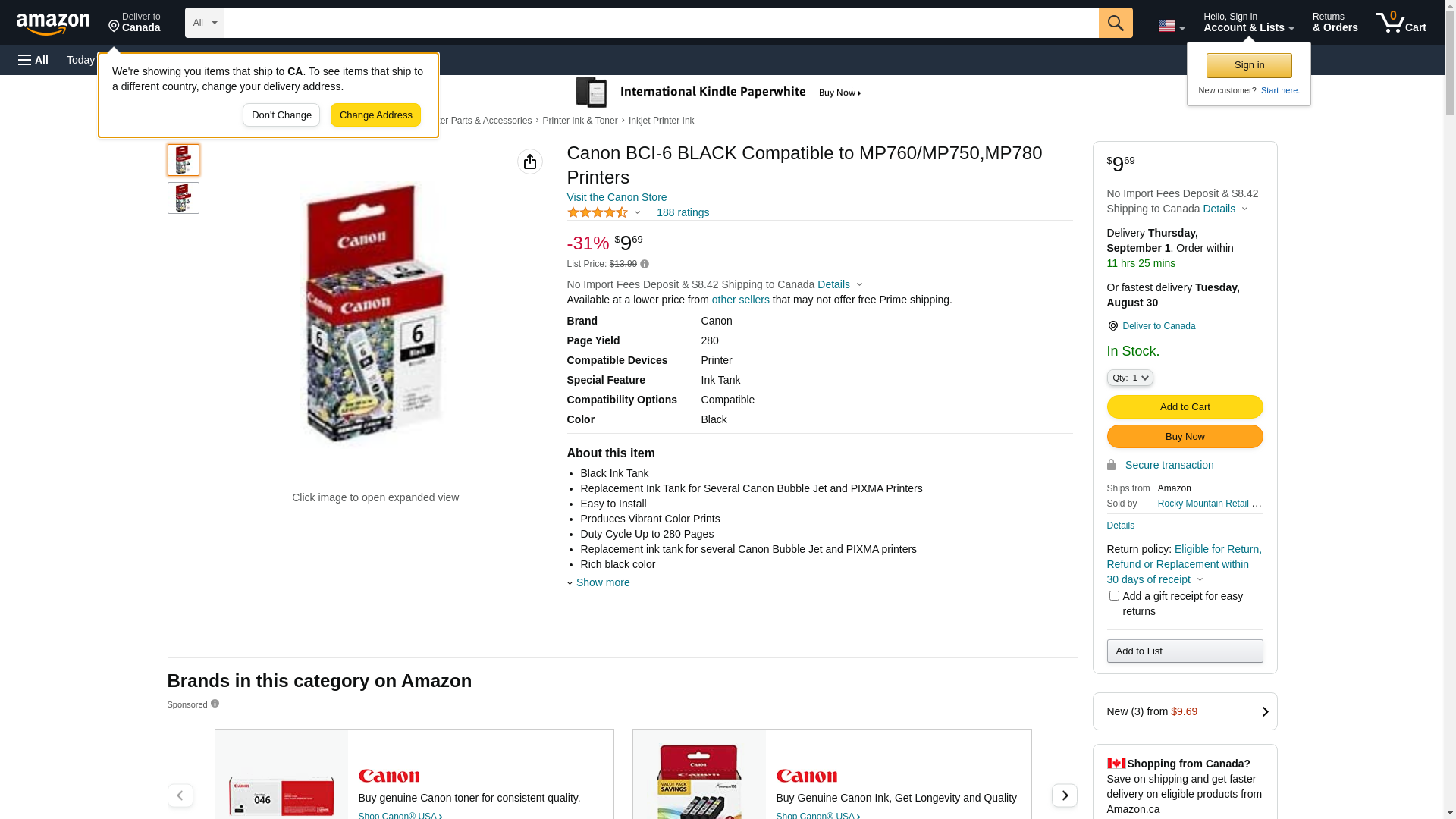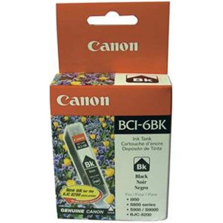 | Feature | Consumable Type: Ink Tank| Printer Technology: Ink-jet| Output Color: Black| Printer Compatibility: IP8500,IP6000D,IP5000,IP4000R,IP4000,I9900,I9100,I960,I950,I900D,I860,S9000,S900,MP780,MP760,MP750,S830D,S820D,S820,S800,BJC8200| Yield: 280 Pages @ 5% Coverage| Header / Model: BCI 6 |