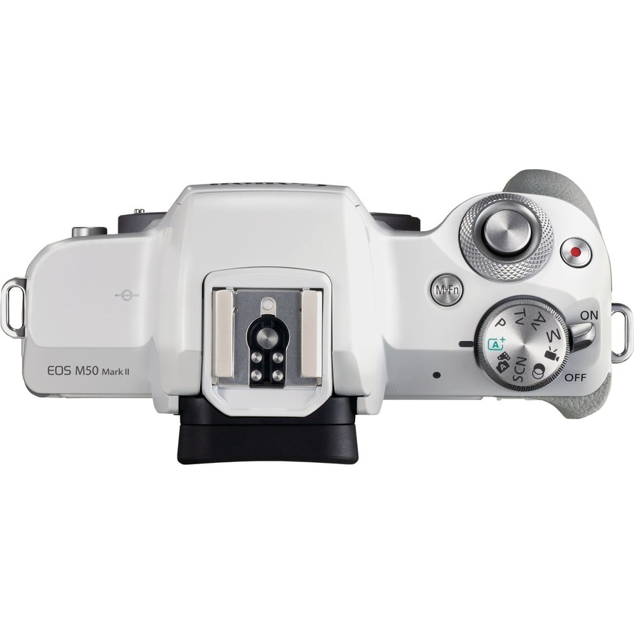 <br>Catering to vloggers and content creators, the white Canon EOS M50 Mark II is a versatile multimedia camera with a well-rounded photo and video feature-set. Sporting improved focusing, recording, and sharing capabilities, the M50 Mark II still revolves around the proven 24.1MP APS-C CMOS sensor and DIGIC 8 image processor, which enable a quick 10 fps shooting rate, a native sensitivity range of ISO 100-25600, and UHD 4K video recording at 23.98 fps, along with Full HD 1080p60 and HD 720p120 for slow motion capture. Sensor-based Dual Pixel CMOS AF has been improved with faster speeds and refined Eye Detection AF performance, and supports both Eye Detection and Face Detection focusing modes when working with Movie Servo AF to help keep sharp focus on the subject matter. Additionally, Combination IS 5-axis image stabilization also helps to realize steady, shake-free recording by minimizing the appearance of camera shake.<br><br>Manufacturer Included Items:<br><br>Canon EOS M50 Mark II Mirrorless Camera with 15-45mm Lens (White)<br>Canon EF-M 15-45mm f/3.5-6.3 IS STM Lens (Silver)<br>Canon LP-E12 Lithium-Ion Battery Pack (7.2V, 875mAh)<br>Canon Battery Charger LC-E12 for Battery Pack LP-E12<br>Canon R-F-4 Camera Cover (Body Cap) for EOS M Mirrorless Camera<br>Canon EM-200DB Neck Strap<br>Terminal Cover<br><br>Bundle Items Include:<br><br>1 x Canon EOS M50 Mark II Mirrorless Camera with 15-45mm Lens (White)<br>1 x SanDisk SecureDigital 64GB Extreme PRO Memory Card<br>1 x Memory Card Reader<br>1 x Deluxe Soft Case<br>1 x 12_inch Flexible Tripod<br>1 x Hand Strap<br>1 x Memory Card Wallet<br>1 x Lens Cap Keeper<br>1 x Cleaning Kit<br>