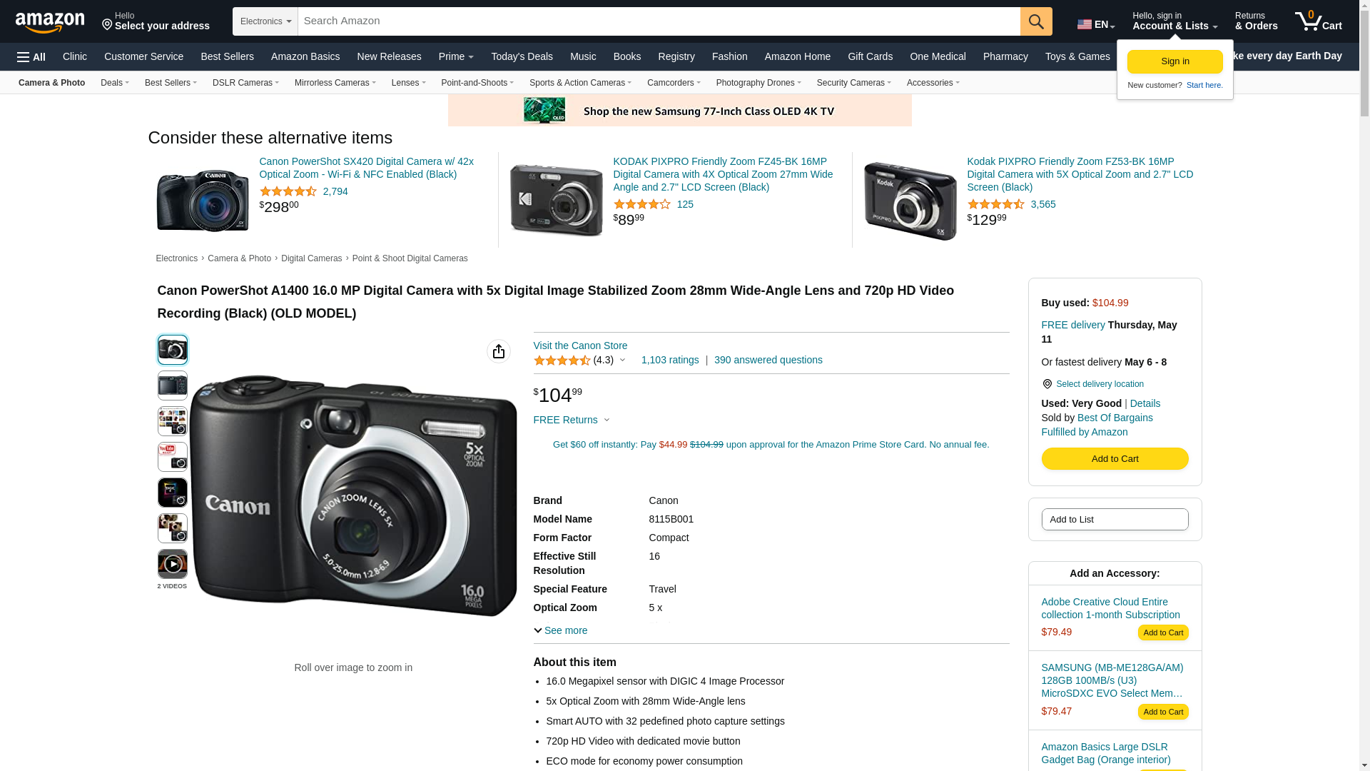 Canon PowerShot A1400 16.0 MP Digital Camera with 5X Digital Image Stabilized Zoom 28mm Wide-Angle Lens and 720p HD Video Recording (Black)