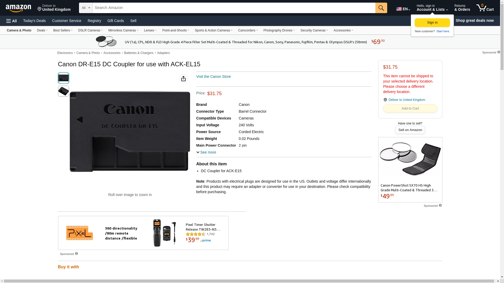 Canon DR-E15 DC Coupler for use with ACK-EL15