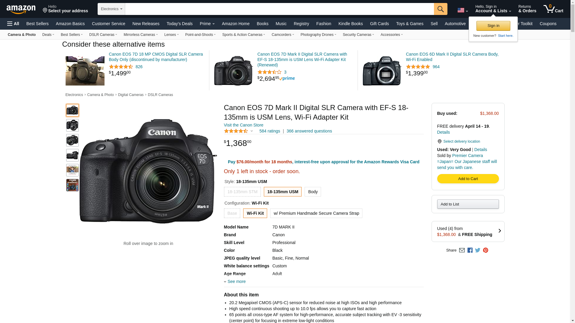 An already very capable imaging machine, the EOS 7D Mark II DSLR Camera with 18-135mm Lens and W-E1 Wi-Fi Adapter from Canon takes the camera's capabilities up a notch with the inclusion of an SD-card-sized item that adds Wi-Fi connectivity to the camera.<br><br>Designed with a penchant for speed, the 7D Mark II is characterized by its APS-C-sized 20.2MP CMOS sensor, dual DIGIC 6 image processors, and a top continuous shooting rate of 10 fps. Both a 65-point all cross-type phase-detection AF system and Dual Pixel CMOS AF technology benefit fast, accurate focusing performance for both optical viewfinder and live view shooting. Additionally, the combination of the dual image processors along with the CMOS sensor also contribute to enhanced low-light sensitivity to a native ISO 16000, which is further expandable to ISO 51200. The 7D Mark II comfortably performs in a range of challenging situations, and while ideally situated as a tool for sports and wildlife photographers, it resides equally as well in the hands of contemporary multimedia image-makers.<br><br>Bundle Items Included:<br><bR>Canon EOS 7D Mark II DSLR Camera<br>W-E1 Wi-Fi Adapter<Br>EF-S 18-135mm f/3.5-5.6 IS USM Lens<br>LP-E6N Lithium-Ion Battery Pack (7.2V, 1865mAh)<br>LC-E6 Charger for LP-E6 Battery Pack<br>Eyecup Eg<br>RF-3 Body Cap for Canon EOS Cameras<br>IFC-150U II USB 3.1 Gen 1 Interface Cable for DSLRs<br>Wide Camera Strap<br>Battery Cover<br>Software CD-ROM<br>Limited 1-Year Warranty<br>Microfiber Cloth<bR>Cleaning Kit<bR>Carry Case<br>32GB Memory<br>Memory Card Wallet<br>USB Card Reader