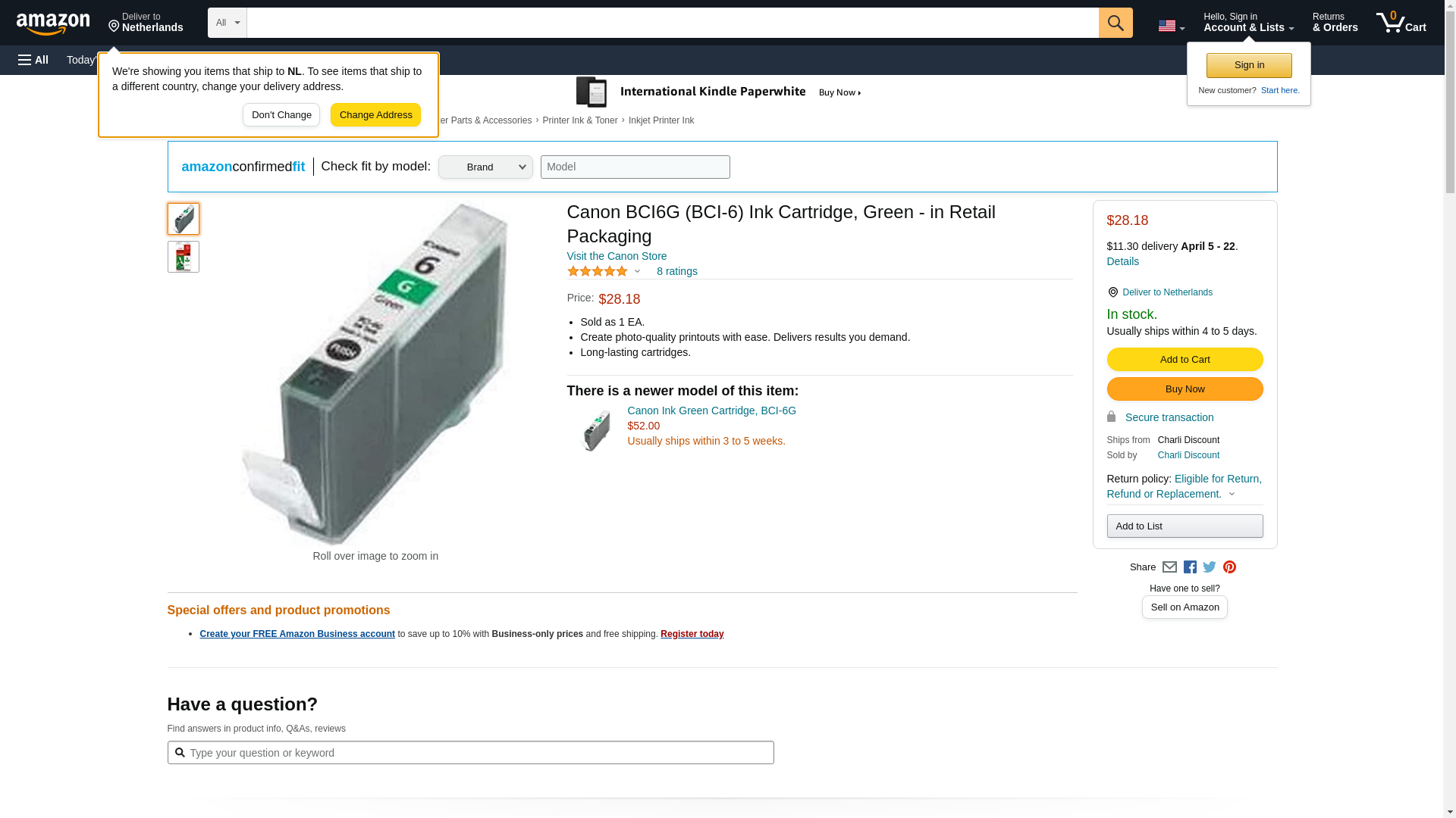 Canon BCI6G (BCI-6) Ink Cartridge, Green - in Retail Packaging