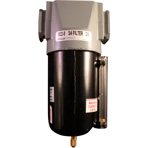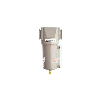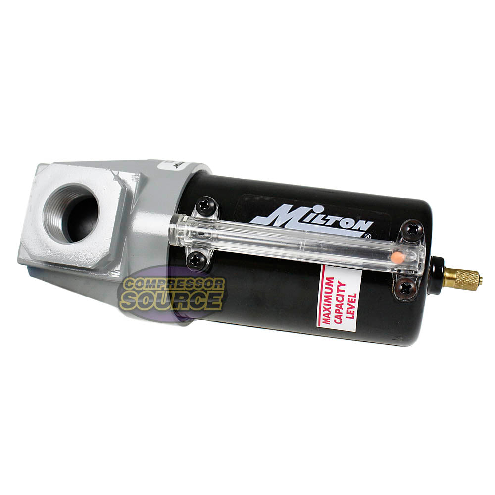 This 3/4" NPT Milton micro filter is supplied with pre-assembled automatic overnight drain, 3 stage baffle system and a porous bronze 40 micron filter element. Micro filters remove harmful water or oil condensate, pipe scale, dirt and rust from compressed air systems. The corrosion resistant metal bowl has a capacity of 10 ounces and is protected by a safety metal bowl guard. Maximum of 250 PSI and 230 SCFM. Features 3/4" national pipe thread Maximum pressure of 250 pounds per square inch Maximum of 230 standard cubic feet per minute at 100 pounds per square inch Install upstream from regulators Temperature range of 40 degrees Fahrenheit to 160 degrees Fahrenheit 10 oz metal bowl capacity