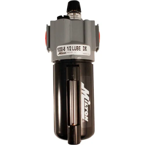 This 1/2" NPT lubricator with metal bowl is the drip style, which allows precise settings for trouble free protection. The adjusting knob can be removed in order to prevent tampering and the sight glass dome allows observation for instant drip rate adjustment. The 6 ounce meal bowl may be filled without shutting down line pressure, delivering oil at an air flow as low as 2 SCFM. Lubricator is designed to provide oil to air tools that require oil for operation. Maximum pressure of 200 PSI and 142 SCFM. 1/2" national pipe thread Maximum pressure of 200 pounds per square inch Maximum of 142 standard cubic feet per minute at 100 pounds per square inch Operating temperature range of 40 degrees Fahrenheit to 120 degrees Fahrenheit All Milton FRL components are 100% tested before leaving the factory