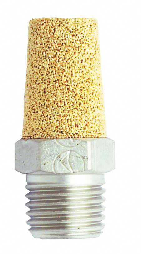 1086-2 1/8" MNPT exhaust muffler is perfect for reducing pneumatic noise levels in the work environment. Muffler - filters use a porous sintered bronze, bonded to a copper plated steel pipe threaded fitting. 40 micron filters diffuse air and muffle noise from exhaust ports of air tools, cylinders and valves to an acceptable noise requirement. 7/16" Hex size Maximum pressure of 300 pounds per square inch Maximum air flow of 20 standard cubic feet per minute at 100 pounds per square inch Operating temperature range of 40 degrees Fahrenheit to 300 degrees Fahrenheit Total length of 1 1/8"