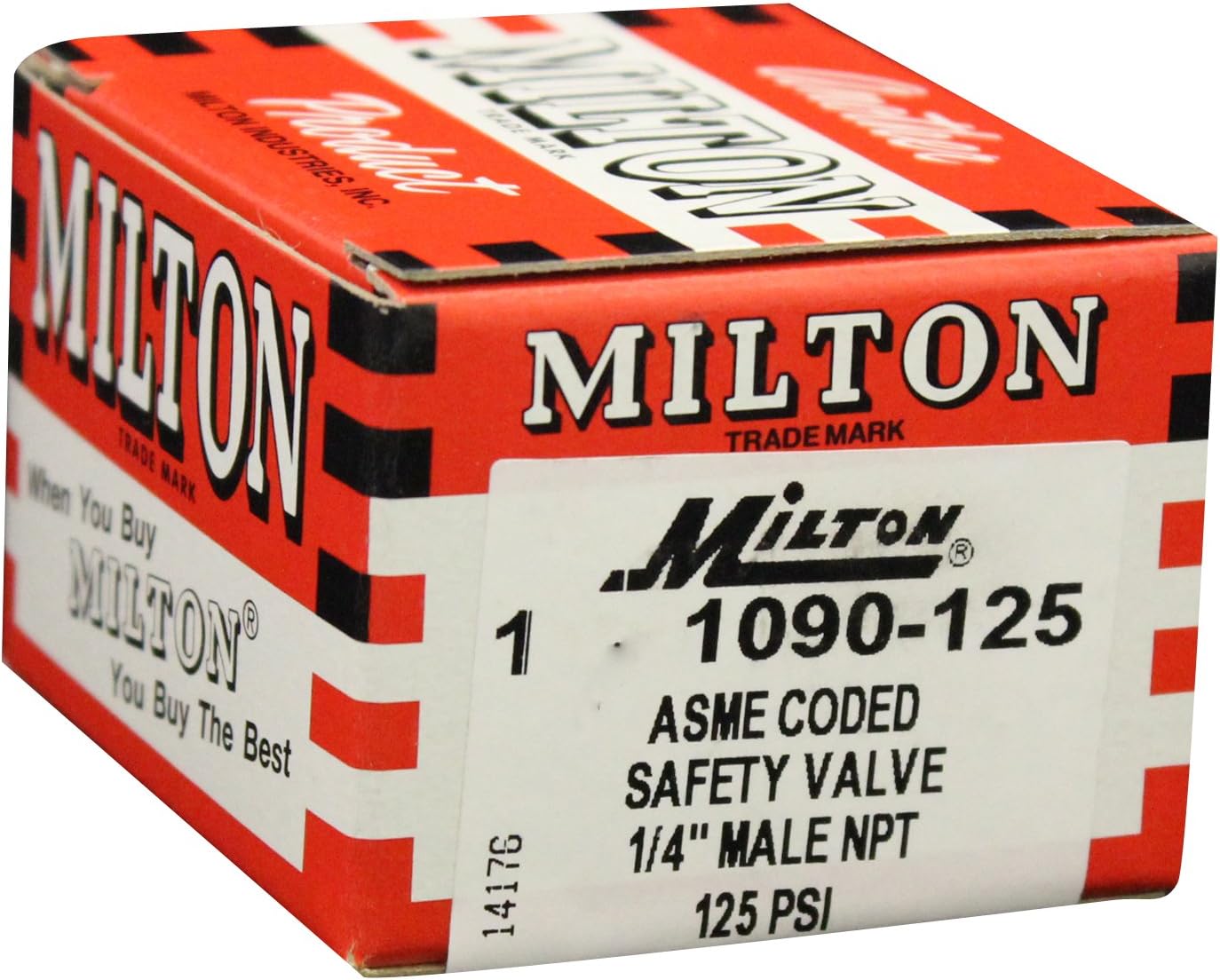 Milton, 1090-125, ASME Safety Valve - 125 PSI Pop off Pressure, 1/4" MNPT 1/4" MNPT ASME safety valves are manufactured to ASME standards and certified by the national board of boiler and pressure vessel inspectors. Valves are interchangeable with all other ASME valves of same size and pressure. Valve resets after pressure drops by 50%. Valve has a pop off pressure of 125 PSI. Bubble tight to 10% of set pop off pressure 1/4" Male national pipe thread 120 standard cubic feet per minute Pop off pressure of 125 pounds per square inch