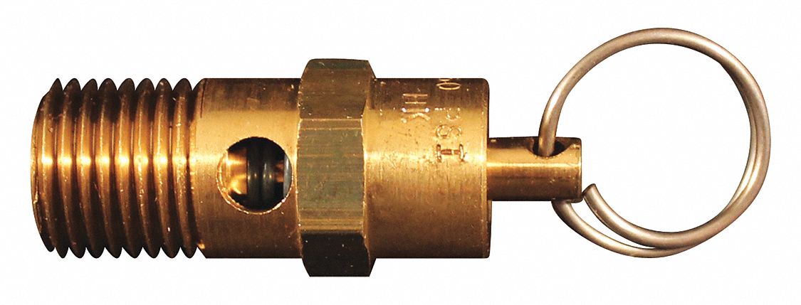 This 1/4" MNPT safety relief valve is constructed with the same materials as ASME safety valves, but is not national board certified so they cannot be used on applications requiring ASME components. The non-coded valve is equipped with a lift ring for instant relief and is stacked at the factory at the pre set pop-off pressure. Has a pop-off pressure of 125 PSI. These valves are not for use on compressors with a capacity over 15 CFM, 3 HP or 12 gallon storage tank. 1/4" male national pipe thread 125 pounds per square inch pop off pressure 1 5/8" total length