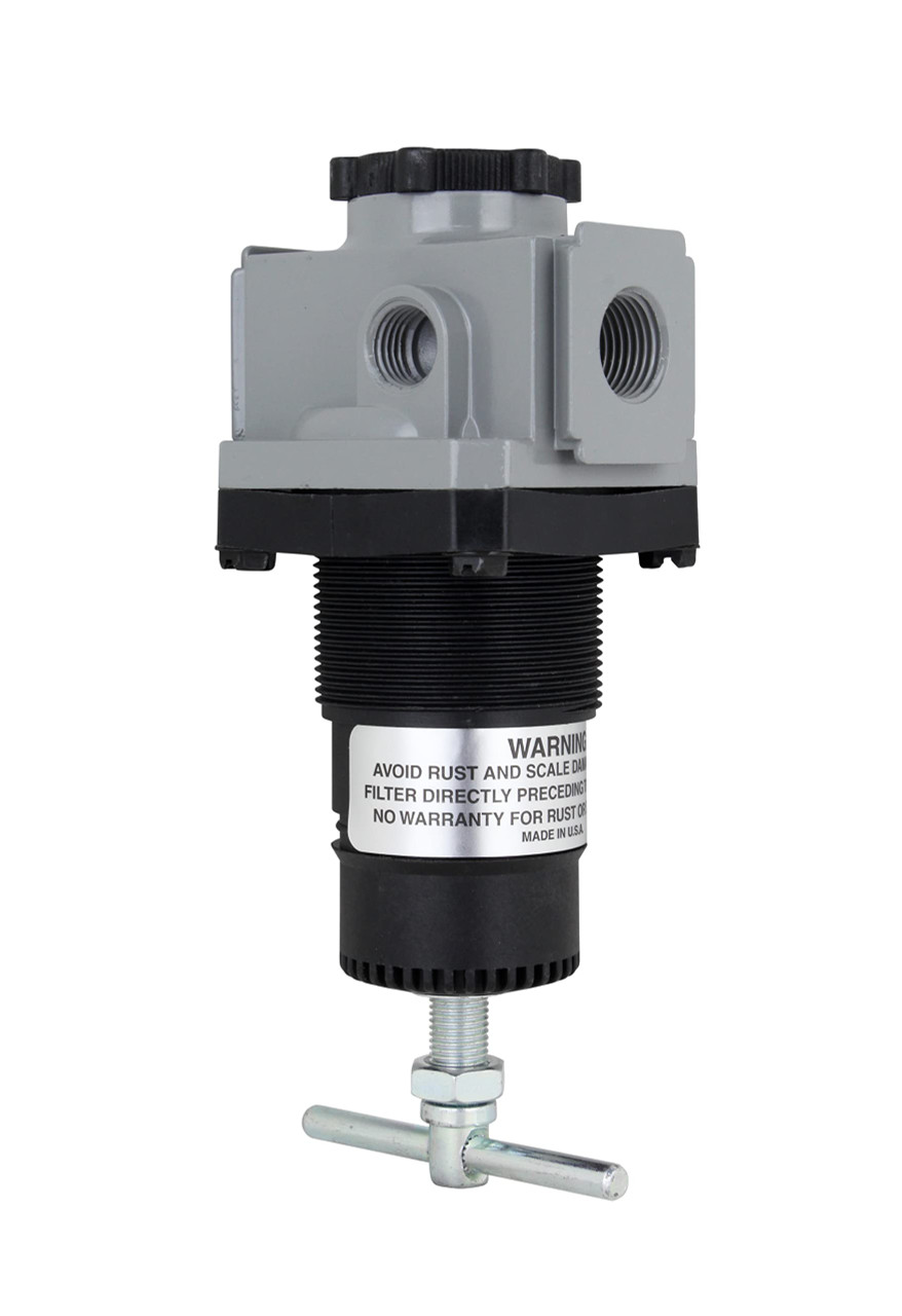 3/8" NPT mid-size regulator is the relieving type which offers stable downstream air pressure over a wide range of air flows with accurate control, fast response and minimal pressure drop. Regulators should always be preceded by a filter to eliminate damage to the unit or inaccurate air flow. The aluminum die cast body comes with a balanced piston, molded rubber seat, Buna-N diaphragm and O rings. This regulator also has two offset 1/4" gage ports which can serve as two 1/4" supply lines. Offers a maximum inlet pressure of 250 PSI and 80 SCFM. 3/8" national pipe thread Maximum of 80 standard cubic feet per minute at 100 pounds per square inch Operating temperature range of 40 degrees Fahrenheit to 120 degrees Fahrenheit