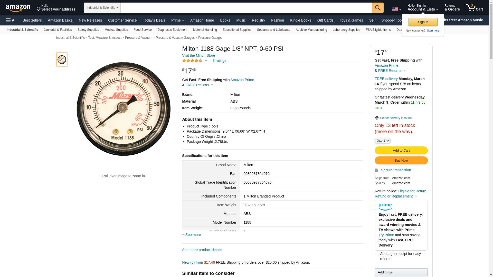 MILTON 1188 - Gage 1/8 NPT, 0-60 PSI"