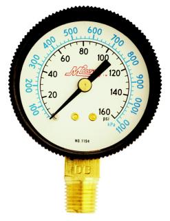 Use this pressure gauge for reliable service with compressors, regulators, air lines, pneumatic tools and equipment. Made up of a brass mechanism, ABS case and a polycarbonate lens, this gauge is resistant to heat, corrosion, water, salt water and oil. Can also be used in steam applications if less than 120 degrees Fahrenheit. The 1/4" NPT pressure gauge has a bottom mount and offers a pressure range of 0 to 60 PSI. 2" face diameter. 1/4" national pipe thread Pressure range of 0 to 60 pounds per square inch Temperature range of 40 degrees Fahrenheit to 140 degrees Fahrenheit
