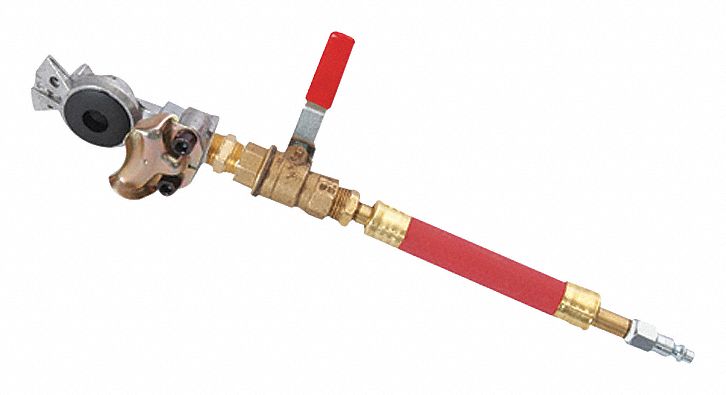 Semi trailer air brake testing tool has a glad hand coupler for quick connection of air lines. Connect air lines to the service and emergency brake lines of the semitrailer in order to test brakes when separated from truck/trailer. Comes with a cushioned grip for comfort and a ball valve shut off. Glad hand coupler for quick connection Cushioned grip Ball valve shut off