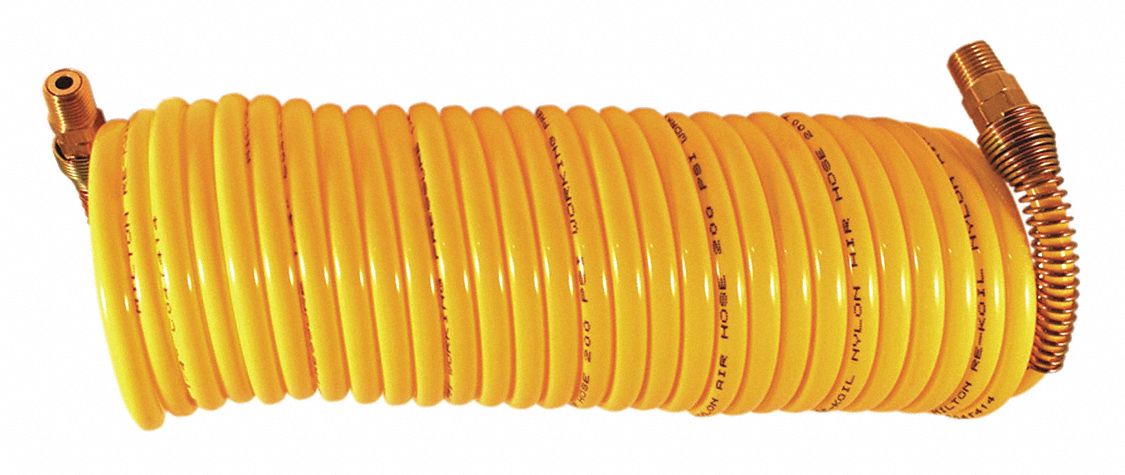 This 12 foot nylon ReKoil hose is assembled with reusable, full flow 1/4" MNPT swivel fittings on both ends to avoid twisting and kinking. Nylon re-koil hose is perfect for connecting to overhead air lines to keep the hose off the floor and resists abrasion. Maximum working pressure of 200 PSI at 70 degrees Fahrenheit. 1/4" male national pipe thread 1/4" hose inside diameter Working temperature range of -40 degrees Fahrenheit to 180 degrees Fahrenheit