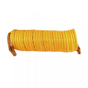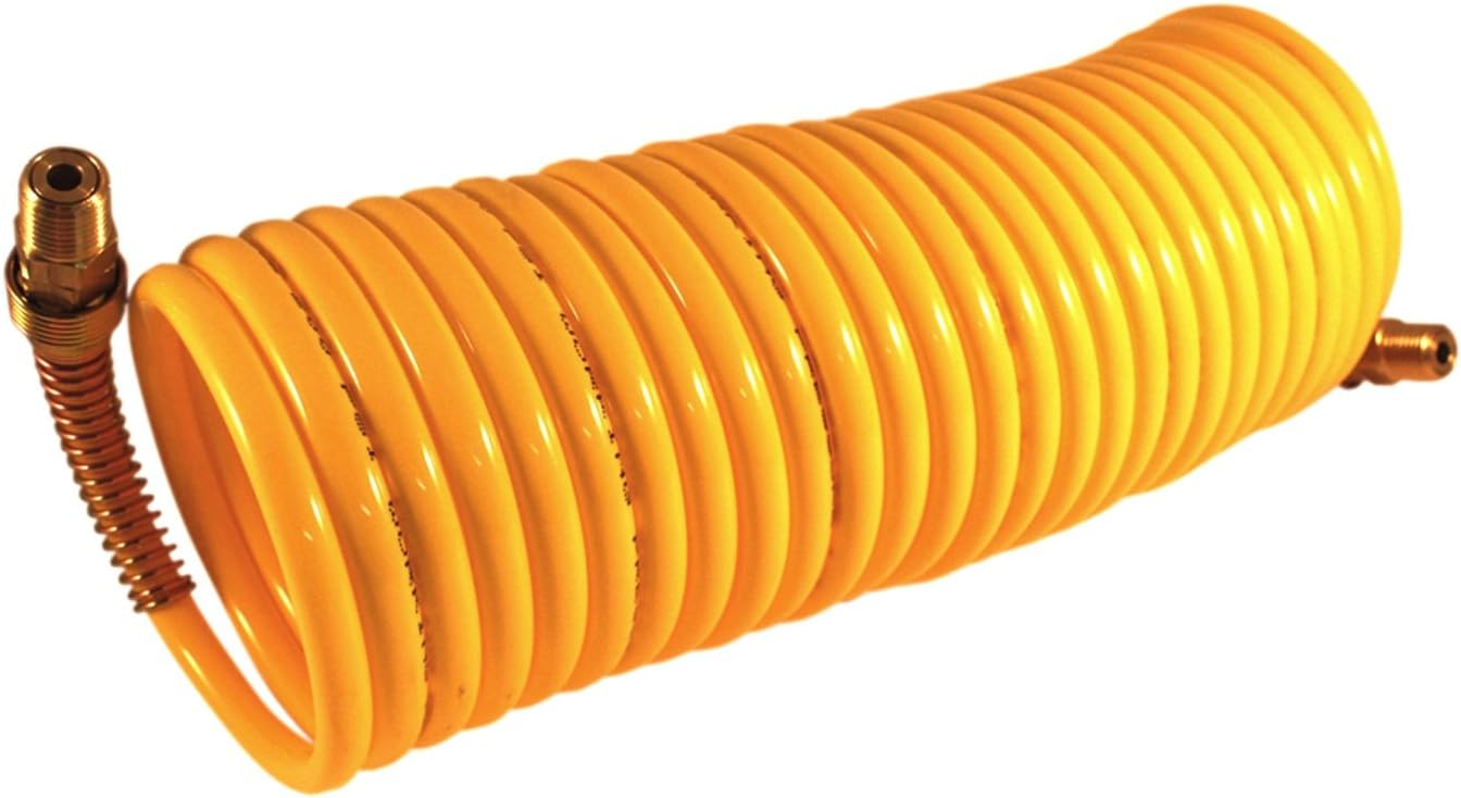 This 25 foot nylon ReKoil hose is assembled with re-usable, full flow 1/4 in. MNPT swivel fittings on both ends to avoid twisting and kinking. Nylon re-koil hose is perfect for connecting to overhead air lines to keep the hose off the floor and resists abrasion. Maximum working pressure of 200 PSI at 70 degrees Fahrenheit. 1/4" male national pipe thread 1/4" hose inside diameter Working temperature range of -40 degrees Fahrenheit to 180 degrees Fahrenheit
