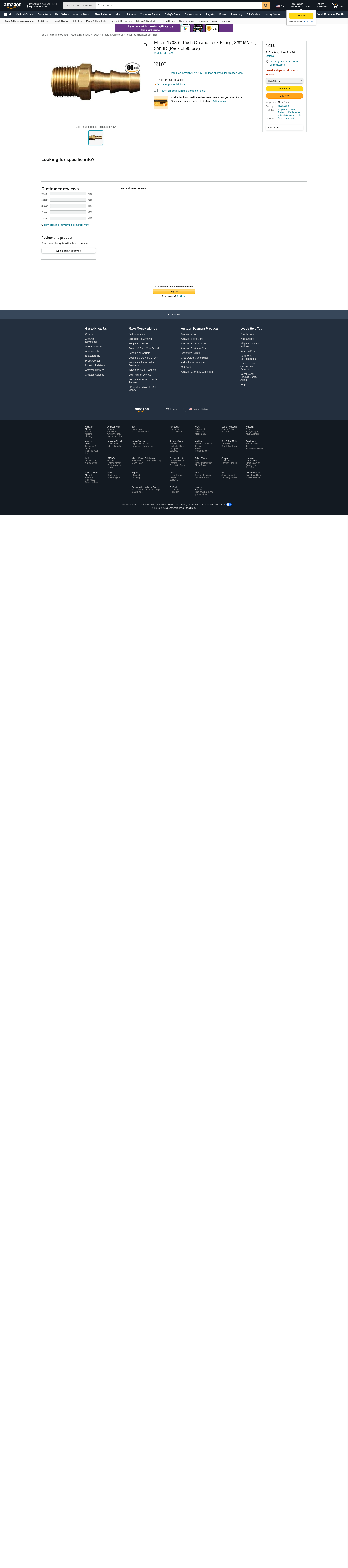 Milton 1703-6, Push On and Lock Fitting, 3/8" MNPT, 3/8" ID (Pack of 90 pcs)