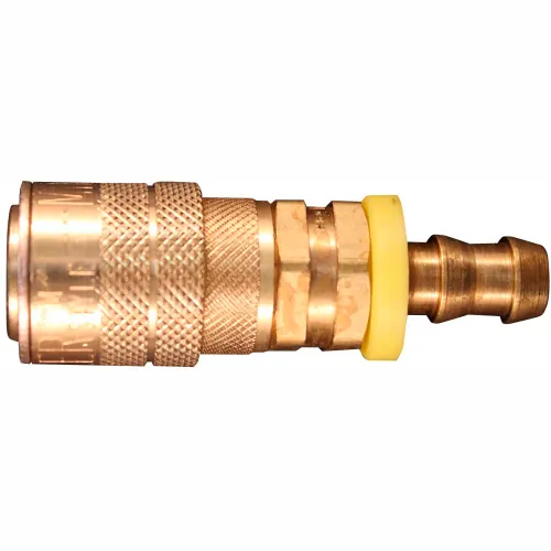 1717-6 These 3/8" hose barbs feature a steel drag guard to prevent accidental uncoupling. M style couplers offer a basic flow size of 1/4" and have a maximum inlet pressure of 300 PSI. Designed specifically for Milton push on and lock on air hoses, these hose barbs require no clamps or ferrules; simply push the fitting in. Brass body with a Buna-N seal. 3/8" connection 40 standard cubic feet per minute Maximum inlet pressure of 300 pounds per square inch Maximum temperature of 250 degrees Fahrenheit Complies with military specifications MIL-C-4109