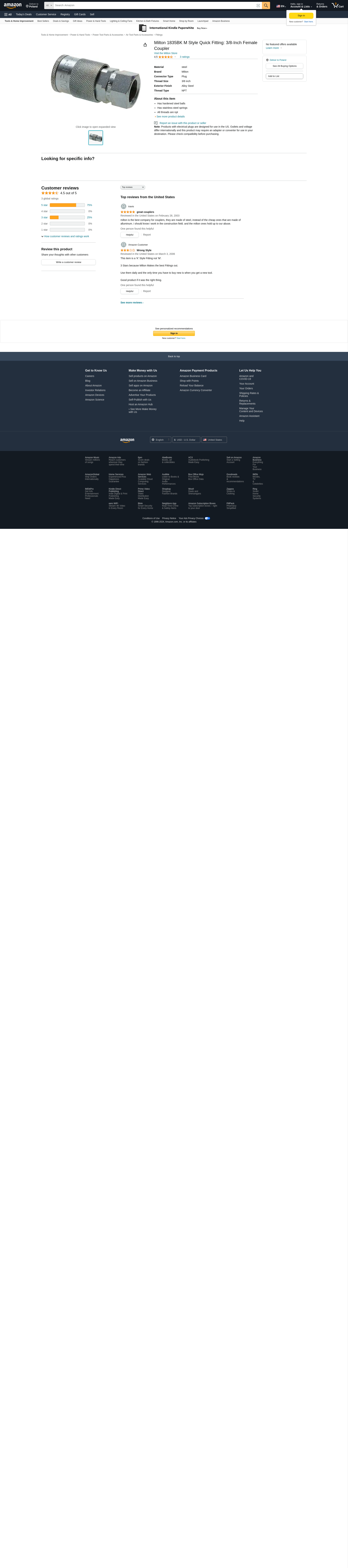 Milton 1835BK M Style Quick Fitting: 3/8-Inch Female Coupler