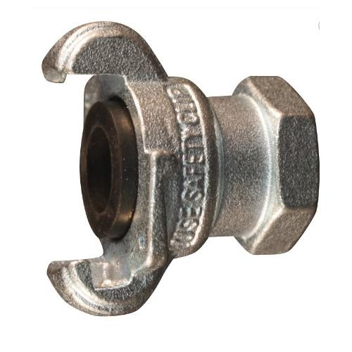 This 3/4" FNPT twist lock universal coupler is made of malleable iron and comes complete with safety clip and lanyard. These couplers with two claws are great for construction, highway maintenance, mining mobile compressors, agriculture and tool rental shop applications. Also known as crowfoot, claw type or Chicago style couplers, these twist lock universal couplers have a maximum working pressure of 150 PSI. 3/4" female national pipe thread Maximum pressure of 150 pounds per square inch Maximum temperature of 160 degrees Fahrenheit Can be used with other twist lock universal couplers sized 1/4" to 1"