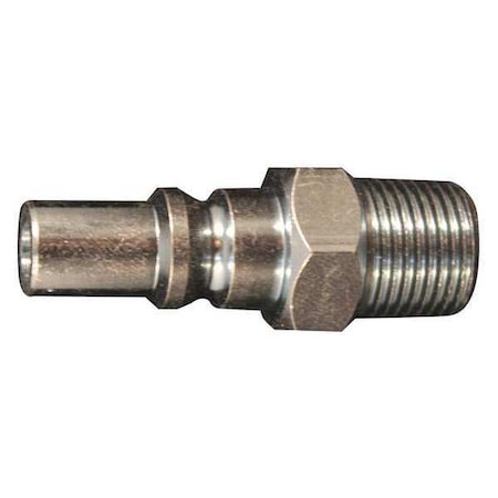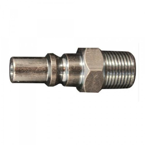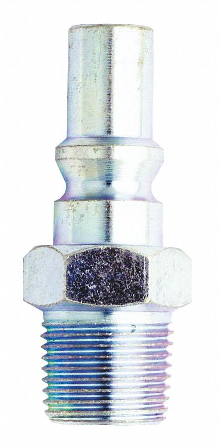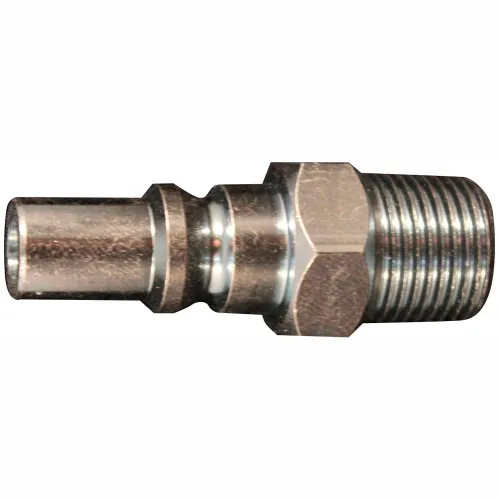 Milton AA style plugs are made of case hardened steel and are plated to resist rust. Featuring a push type sleeve, this 3/8" MNPT AA style plug has a basic flow size of 3/8" and a maximum inlet pressure of 300 PSI. Air flow of 59 SCFM. 3/8" male national pipe thread Maximum inlet pressure of 300 pounds per square inch 59 standard cubic feet per minute Maximum temperature of 250 degrees Fahrenheit