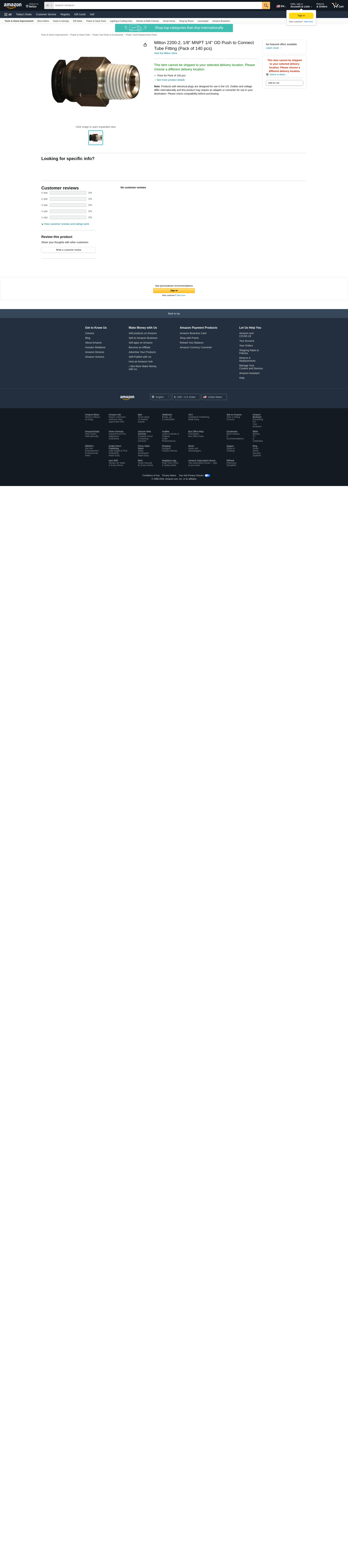 Milton 2200-2, 1/8" MNPT 1/4" OD Push to Connect Tube Fitting (Pack of 140 pcs)