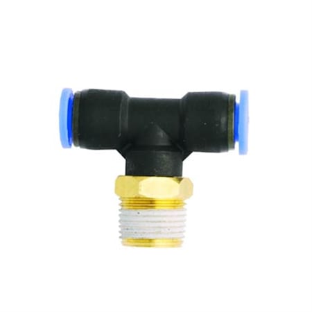1/4" MNPT 1/4" OD Push to Connect Swivel Branch Tee. Features: 1/4" male national pipe thread 1/4" outside diameter Maximum working pressure of 150 pounds per square inch Buna-N seal 1/4" MNPT push to connect swivel branch tee fittings offer easy installation of air lines. Simply push tubing into fitting, no gluing or special tools required. This 1/4" OD connector is reusable by simply pushing sleeve in and releasing the tubing. Push to connect fittings allow for maximum air flow and faster connection than standard compression fittings. Great for the garage or shop, these swivel tee fittings pivot 360 degrees Fahrenheit or easy installation and use.