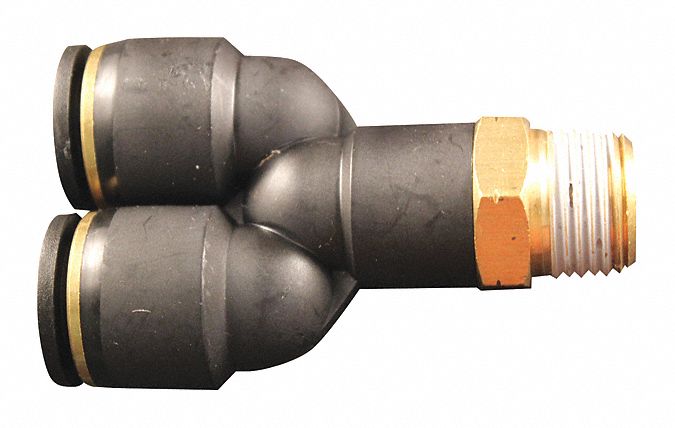 1/4" MNPT 1/4" OD Push to Connect Swivel Y Connector. Features: 1/4" male national pipe thread 1/4" outside diameter Maximum working pressure of 150 pounds per square inch Buna-N seal 1/4" MNPT push to connect swivel Y fittings offer easy installation of air lines. Simply push tubing into fitting, no gluing or special tools required. This 1/4" OD connector is reusable by simply pushing sleeve in and releasing tubing. Push to connect fittings allow for maximum air flow and faster connection than standard compression fittings.