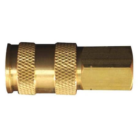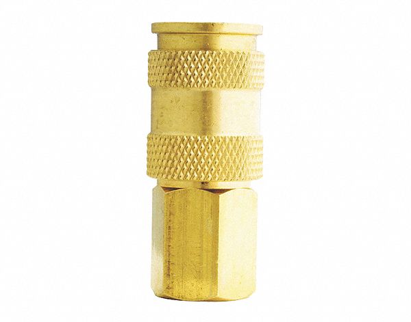 1/4" FNPT V Style High Flow Coupler. Features: 1/4" female national pipe threads Maximum inlet pressure of 300 pounds per square inch Air flow of 74 standard cubic feet per minute Maximum temperature of 250 degrees Fahrenheit 1/4" FNPT high flow V style couplers will accept A, M and V style plugs, however, to retain maximum air flow use V style plugs. Sleeve release is a push type and is easy to use; simply push plug into coupler to engage, pull sleeve back to remove. Perfect for high volume, low pressure applications. V style couplers have a 1/4" basic flow size and a maximum pressure of 300 PSI.