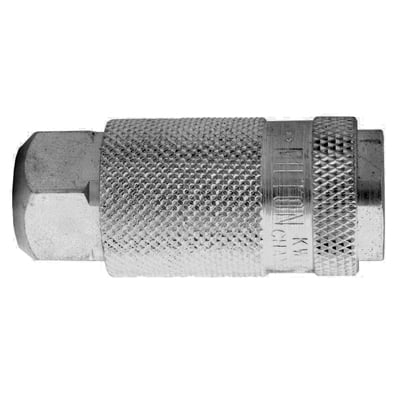 1/4" FNPT L Style Coupler. Features: 1/4" female national pipe thread Air flow of 32 standard cubic feet per minute Maximum temperature of 250 degrees Fahrenheit 1/4" FNPT L style coupler is steel plated to resist rust. L style couplers have a 1/4" basic flow size and a maximum pressure of 300 PSI. This push type coupler has a Maximum of 32 SCFM and a Buna-N seal.