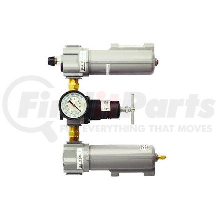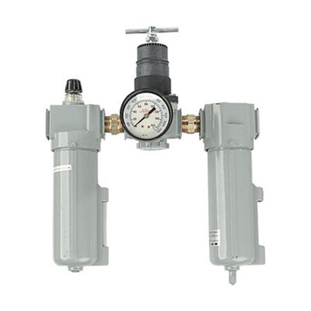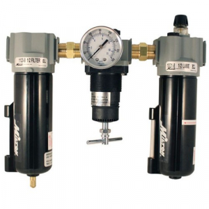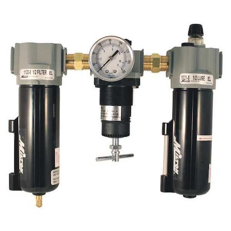 Features:Filter has automatic overnight drainRelieving regulatorDrop style lubricatorComplete with gage #119140 micron filter elementOutlet pressure range: 2-125 PSITemperature range: 40? F to 150? FSpecifications:Max PSI: 250Max SCFM: 100Milton Industries 1102 Deluxe F-R-L Trios - 1/2" NPT Metal Bowl