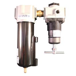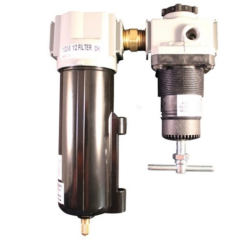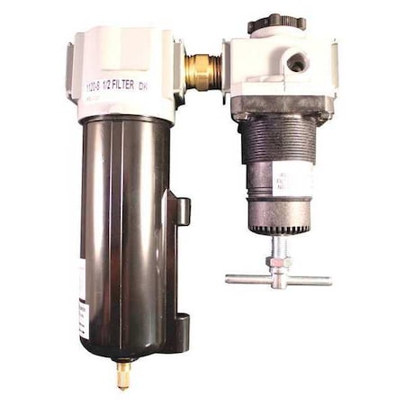 1/2" NPT deluxe FR duo combines the filter and regulator with brass fittings. The filter has an automatic overnight drain and the regulator is the relieving type. This pre-assembled unit has metal bowls and includes a gage. Offers a Maximum pressure of 250 PSI and 100 SCFM. 40 micron filter element. Features 1/2" national pipe thread Maximum of 250 pounds per square inch Maximum of 100 standard cubic feet per minute Operating temperature range of 40 degrees Fahrenheit to 150 degrees Fahrenheit