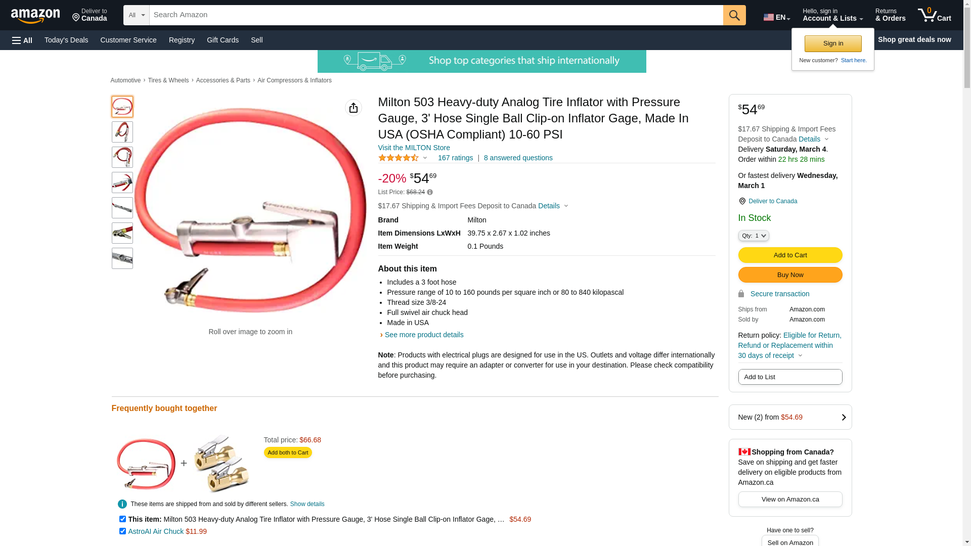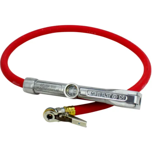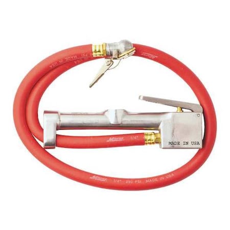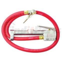 Single Head Air Chuck Inflator Gauge. Features: Full swivel air chuck head Includes a 3 foot hose Pressure range of 10 to 160 pounds per square inch or 80 to 840 kilopascal Thread size 3/8-24 This inflator gauge is made with heavy duty construction which provides long life even under extreme use and conditions. Its single head air chuck comes with a chuck clip to quickly attach. Milton inflator gauges come with both a magnifying window lens and a full swivel chuck. Has a pressure range of 10 to 160 PSI in 2 pound increments or 80 to 840 kPa in 20 kilopascals.