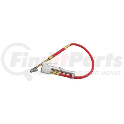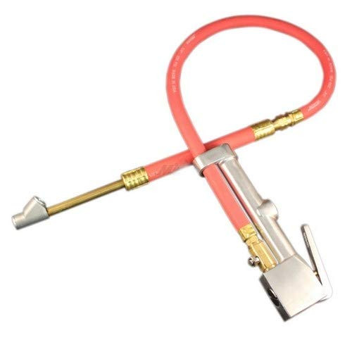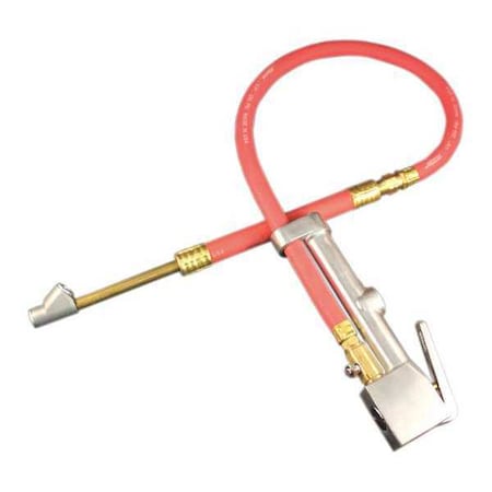 Extended reach tire inflator gage has a 12" swivel end reach and a dual head straight foot chuck. This inflator gage is designed for truck tire inflation and reads 10 to 160 PSI or 80 to 840 kPa. Comes with a 2' hose and includes push button deflator. Made with heavy duty construction, this gage has a magnifying window lens for an easy read. Features Includes viewing window Pressure range of 10 to 160 pounds per square inch or 80 to 840 kilopascal Includes a 2' hose with 12" swivel chuck