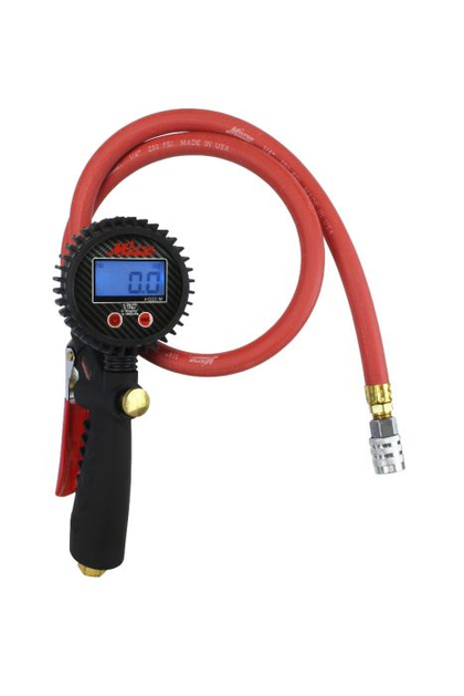 Milton, 572D, Milton PRO Digital Pistol Grip Inflator Gauge with Kwik Grip Safety Chuck Optimize your tire pressure accuracy with this digital inflator gauge, made with a LCD screen measuring in increments of 0.1 PSI and back-lit for better measurement reading in dark environments. This gauge swivels, creating a longer hose with the Kwik Grip Safety Chuck and comes with a 3 foot hose. Our digital gauges also come with a 360 degree swivel gauge (head rotates for an easy and comfortable measurement reading) and +/- 1 PSI accuracy across a range of 0-255 PSI. This turns on automatically when it detects pressure and includes an Auto-shut off feature after 15 seconds that saves on battery life. Designed with a rugged and ergonomic handle grip, shock-absorbing rubber boot, and deflate button for overshot tire pressure. Includes: Digital inflator gauge with rugged comfort-grip handle shock-resistant protective rubber boot deflate button 36" hose Kwik Grip ("quick grip") chuck Construction: This provides 4 units of measurements: (PSI, Bar, kg/cm2, kPa), compared to the traditional 2 units from an analog gauge. Carbon fiber gauge face appearance with a protective rubber boot to shield against impacts. Comfort molded nylon handle with coating is incredibly durable and ergonomic. Steel inflator trigger with separate brass deflation button for quick fine tuning in case you go past your target pressure. Solid brass fittings throughout provide long-lasting performance, with 1/4" NPT female air inlet.