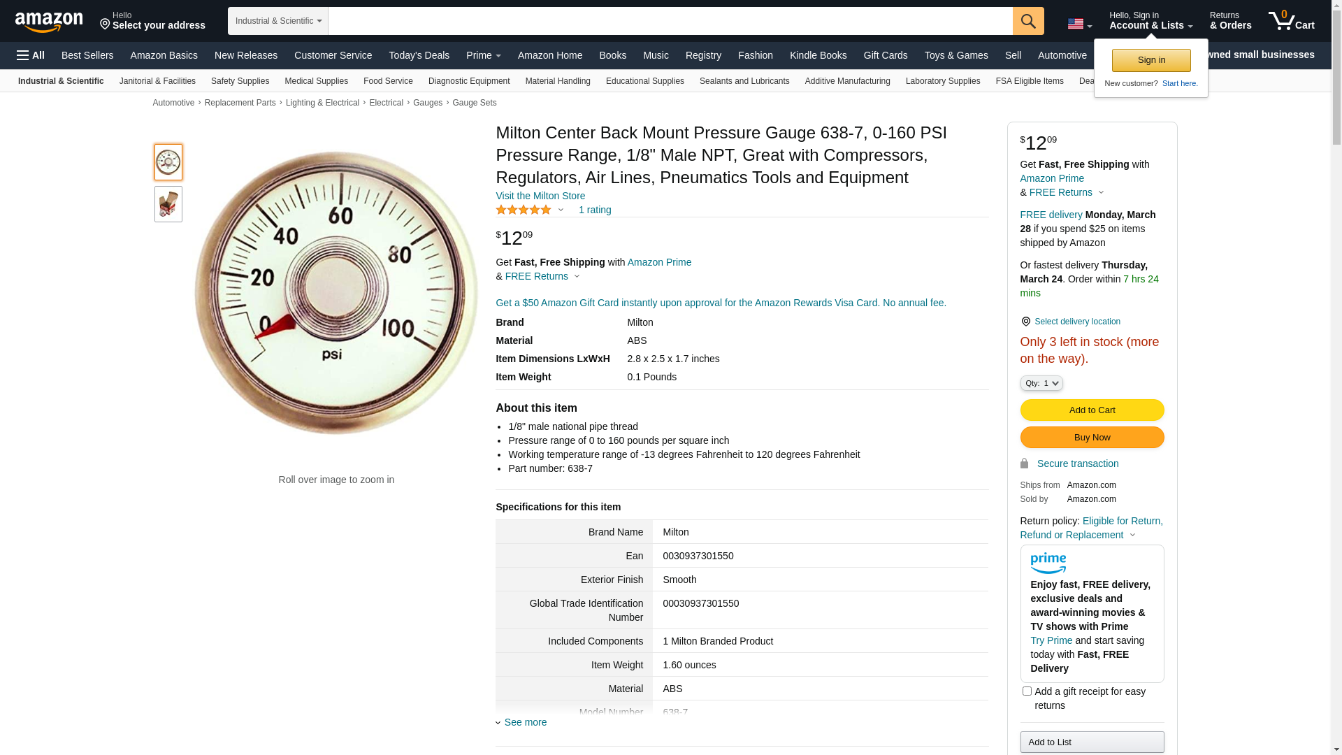 MILTON 638-7 - Gage 0-160 P.S.I. 1/8-27 NPT"