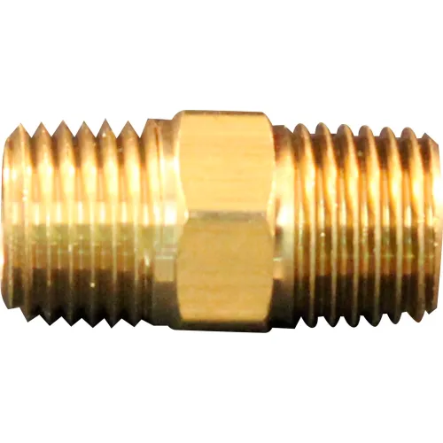 3/8" x 1/2" MNPT Hex Nipple Hose Fitting. Features: 1/2" x 3/8" male national pipe thread Brass hose fitting Male hex nipple