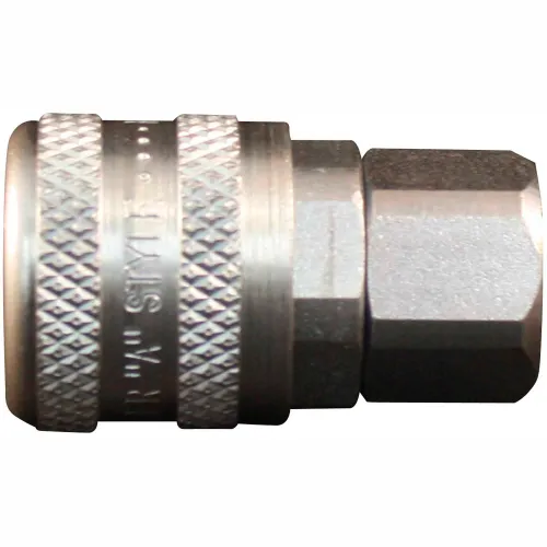 | Feature | 1/4" FNPT A style push type coupler are easy to use; simply push plug into coupler to engage, pull sleeve back to remove. Made of plated steel to resist rust, these couplers have a maximum inlet pressure of 300 PSI. A style couplers have a basic flow size of 1/4" and a maximum air flow of 34 SCFM. |