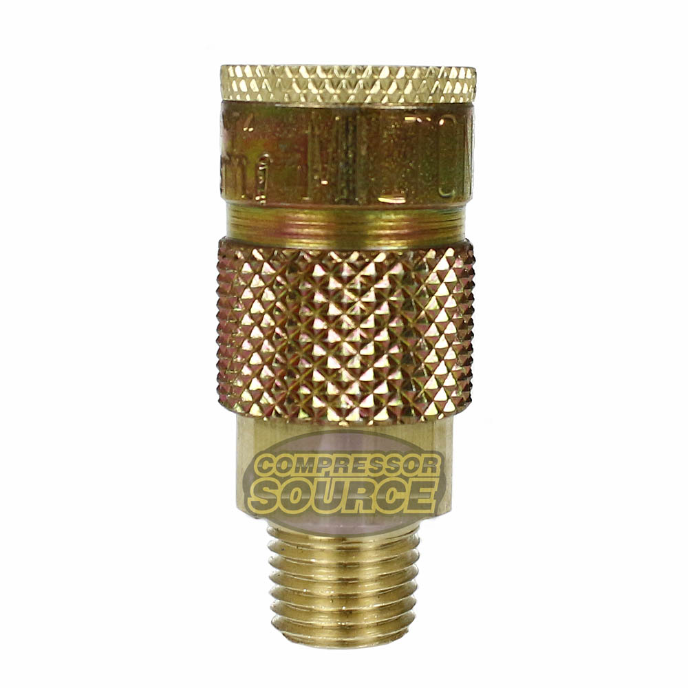 1/4" MNPT T Style Coupler. Features: 1/4" male national pipe thread Maximum of 300 pounds per square inch Air flow of 40 standard cubic feet per minute Maximum temperature of 250 degrees Fahrenheit 1/4" MNPT T style couplers have a brass body and a Buna-N seal. Milton T style couplers have a 1/4" basic flow size and a maximum of 300 PSI. Offers air flow of up to 40 SCFM.